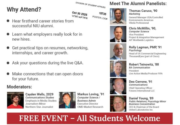 “This panel is about connecting students with alumni who’ve been through the job search, the career pivots, and the leadership lessons that don’t come from textbooks,” said Markus Loving (NIU ’91), Event Lead and co-moderator. “Our goal is to give students real tools; questions to ask, skills to develop, and confidence to pursue opportunities so that they can leave with tangible next steps for their careers.”